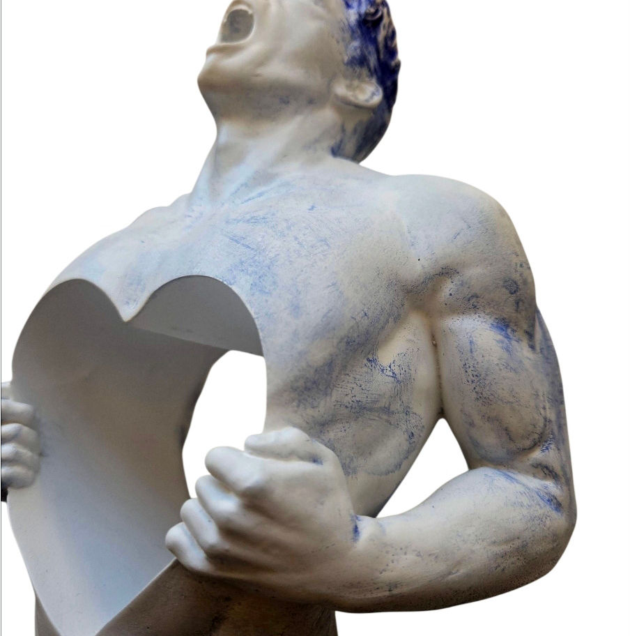 Cette sculpture hypnotique, revêtue d'un rouge métallisé éclatant, capture l'essence de la vulnérabilité et de la force. L'œuvre représente un homme se tenant fièrement, la bouche ouverte en un cri silencieux, évoquant une profondeur émotionnelle intense. Le torse exhibe une ouverture en forme de cœur, symbole poignant d'ouverture et de désir. La finition lisse et réfléchissante du matériau accentue chaque courbe et muscule, créant une interaction dynamique avec la lumière ambiante. Cette œuvre interpelle le spectateur par sa fusion de puissance brute et de délicatesse émotionnelle, transmettant un message universel sur la condition humaine. La posture dramatique et le vide central amplifient l'énergie et l'impact visuel, rendant cette pièce à la fois moderne et intemporelle dans son expression artistique audacieuse.